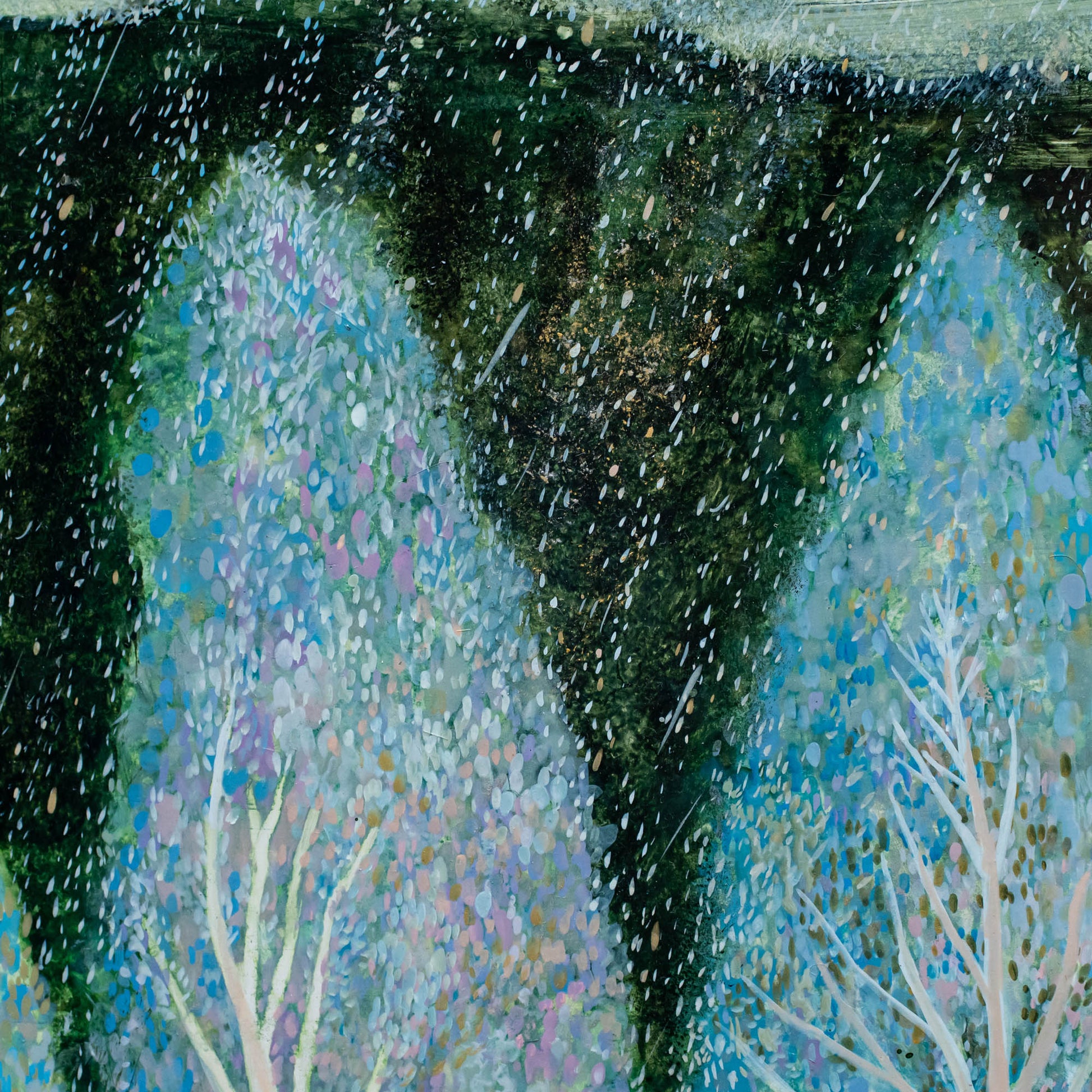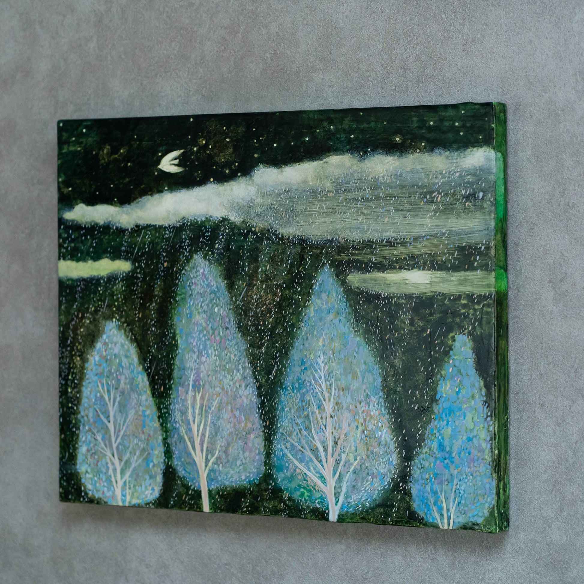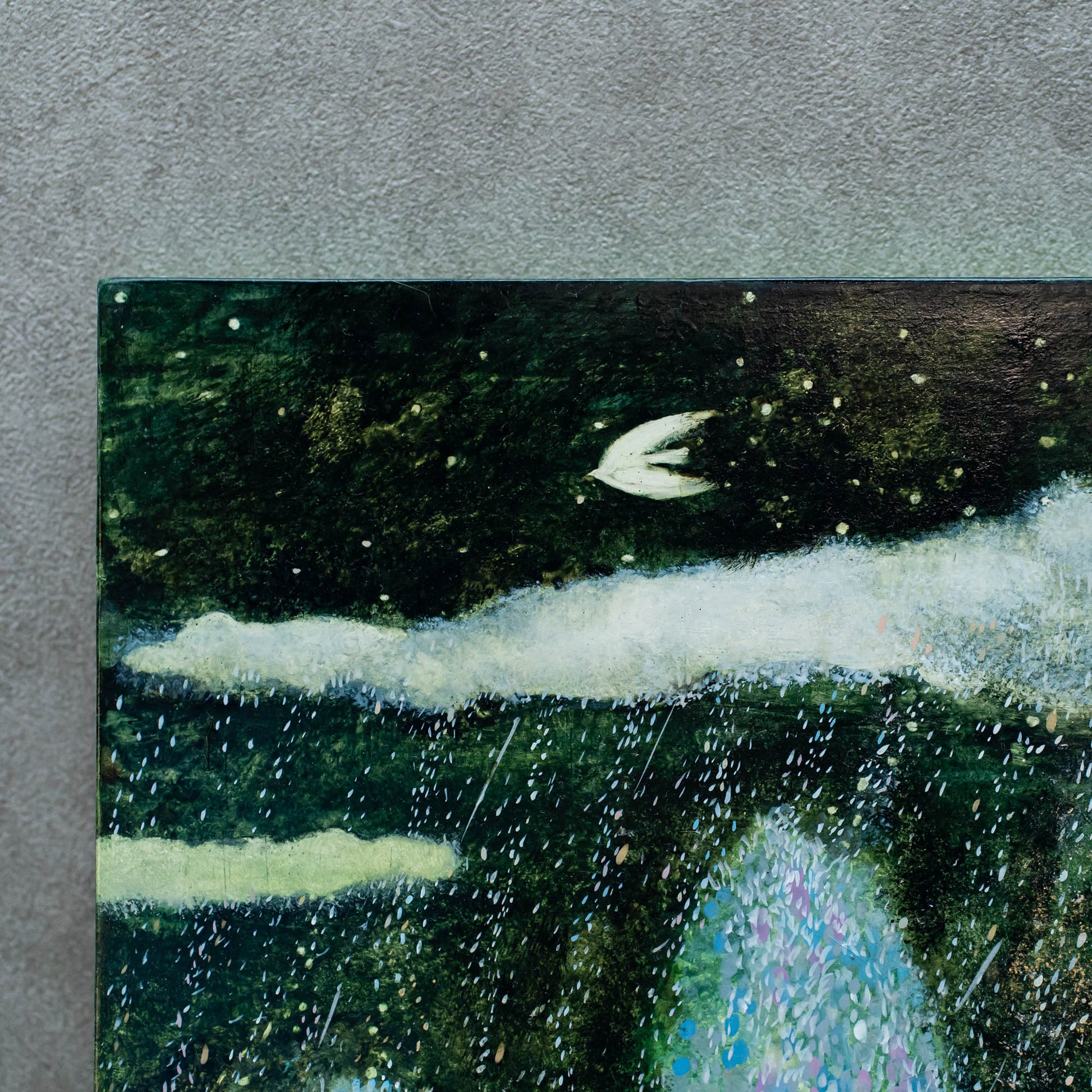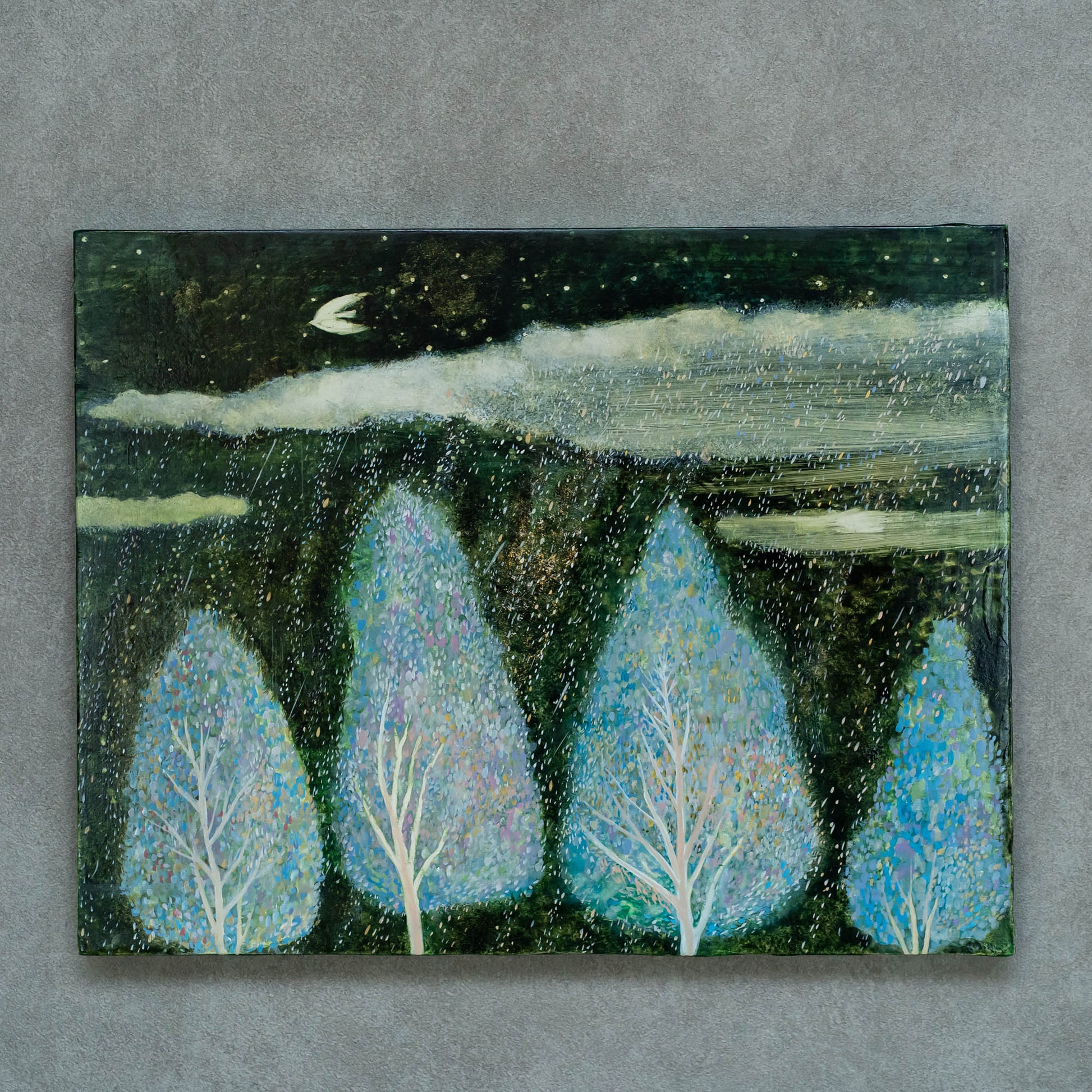 日々の風景から汲み取った心象を自身の中で再構築し、手づくりの下地と透明感のある色彩を重ね合わせながら、静謐で物語性のある世界を描いています。